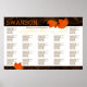 gráfico de assentos do casamento outono. Gráfico de grande tamanho de poster com folhas laranja e bordas de grãos de madeira rústicos. Grande texto para sobrenome e data de casamento. O texto é marrom-escuro. Assentos por sobrenome inicial ou por número/nome da tabela. Exclua as seções desnecessárias.