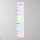 Poster de gráfico de crescimento de cores pastel claras de cor rosa, azul, verde e roxo no fundo. Mantenha-o ou mude-o quando o personalizar. Acompanhe o crescimento do seu filho com este gráfico de crescimento. Começa a 17 polegadas e termina a 65 polegadas. Altere o "Nome" no gráfico. Redimensionar o texto ou adicionar outra fonte. Adicione o clip art ou pequenos desenhos do seu filho ao gráfico. Crie sua aparência de design.
