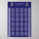 Personalize este elegante design de Gráfico poster de Marinho de Gráficos de de Fósforo Náutico de de Casamento Náutico. design de padrão de faixa azul e branca com duas âncoras de navio de marinho no topo e uma borda de corda azul e branca. Um modelo para uma fácil personalização dos detalhes do seu casamento, como nomes de noiva e noiva, assim como a data do casamento.O mesmo design está disponível em outros suprimentos de papel de carta de casamento correspondentes para carregar o tema do casamento náutico em estilo. Exclua dados do mesa, se você precisar de um gráfico com menor número de mesas.
