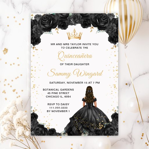 Este elegante e glamouroso gráfico de assentos da mesa Quinceañera apresenta uma coroa dourada e belos arranjos florais pretos com confete dourado. O texto combina o script manuscrito e as fontes sans serif modernas para um aspecto elegante e sofisticado. Gráficos por www.etsy.com/uk/shop/SunflowerDayLove