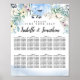 As flores azuis de aquarela acentuadas com flores cremosas, amarelas e cor-de-rosa, menores, criam uma bela borda superior neste assento de 8 Mesas. Há muito verde, folhas e perigos. A borda inferior é uma lavagem de aquarela azul-clara e macia. Muito moderno e moderno. Por favor, encontre seu assento escrito em uma fonte ousada. Os nomes dos casais de casamento estão escritos em uma bela fonte de roteiro.