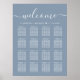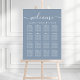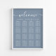 Gráfico de assentos azuis empoeirados para na moda para até 16 mesas com "boas-vindas" em um roteiro branco chic com baloiços e seus primeiros nomes e data de casamento juntos por um coração. Você pode selecionar a opção de download digital a ser editada com alterações de última hora e impressão localmente.
