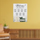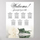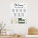 A tabela de assentos de casamento inclui sete mesas e apresenta uma estética impressionante e romântica. Uma rosa de cor branca ou creme, de marfim longo, solitária, repousa horizontalmente, lançando um reflexo numa piscina de água. O título do gráfico é escrito elegantemente na caligrafia de script, lendo "Bem-vindo! Por favor, encontre sua mesa." A seção de baixo dá espaço para os nomes dos casais e a data do casamento. Com dez assentos por mesa, este gráfico acomoda 70 hóspedes e serve como uma ferramenta agradável e prática para guiar os hóspedes aos seus assentos na recepção.