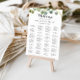 Este gráfico alfabético de folhas verdes tropicais é perfeito para um casamento moderno. A design apresenta lindas folhas verdes pintadas à mão, enfeitando um quadro geométrico dourado. Este sinal pode ser usado para organizar seus convidados em ordem alfabética ou por número de tabela. Ele tem espaço suficiente para cerca de 150 convidados de casamento. Deixe espaço para mais (ou menos) clicando no botão personalizar e aumente ou diminua o tamanho da fonte. Personalize este sinal com os nomes da noiva e do noivo e a data.