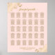 Este lindo gráfico de assentos de casamento apresenta um design simples, mas elegante, com um fundo cor-de-rosa claro e pincelado, fritas de folhas douradas ou filigres florais nos cantos e um título de caligrafia de guião que lê "por favor encontre sua mesa." O gráfico tem atribuições de mesa para 300 convidados em 30 mesas (10 lugares por mesa.)