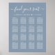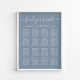 Gráfico de assentos azuis empoeiráveis para na moda para 16 mesas com "Encontre seu assento" em um roteiro chic com baloiços, seus nomes e data de casamento juntos por um coração e os números de mesas e nomes de convidados em uma simples tipografia branca. A opção de download digital permite que você edite com alterações de última hora e impressão localmente.