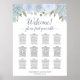 Esta tabela de 12 mesas de assentos de casamento ostenta uma estética que é russa e boêmica. O design é adornado com uma borda de flores, folhas e rosas pintadas manualmente em tons de azul empoeirado e verde-sábio. O título ou título está escrito em uma caligrafia elegante e diz "Bem-vindo! por favor encontre sua mesa". O gráfico também apresenta espaço para os nomes dos casais e sua data de casamento. Pode acolher um total de 120 convidados com 10 lugares por mesa.