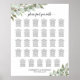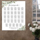 Este lindo gráfico de 29 mesas de assentos de casamento apresenta um design bóico rústico, mas elegante, com imagens pintadas à mão de folhas de eucalipto aquáticas e verde, e um título de caligrafia de script que lê "por favor encontre sua mesa." O gráfico tem atribuições de mesa para 290 convidados em 29 mesas (10 lugares por mesa.)