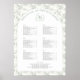 Sinal de assento elegante moderno com inclinação verde e fundo de mosaico. As iniciais do casal enquadradas em cima do arco. Os nomes de convidados agrupados em ordem alfabética de acordo com o sobrenome de convidados, podem agrupar datas para salvar a sala. Mesa na parte inferior.