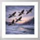 Rather than focusing on strict scientific accuracy, the artwork emphasizes atmosphere, rhythm, and the gentle movement of migratory birds traveling together through the cold season. The soft winter sky, snow-covered fields, and flowing water create a calm and expansive scene that reflects the natural beauty of Japan’s open plains.