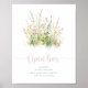 Esta placa de bar aberta de boho silvestre verde é perfeita para um casamento rústico. O design apresenta flores silvestres cor-de-água rosa, pinceladas, amarelas e brancas dispostas em buquês elegantes.