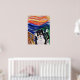 Um tributo cômico reluzente ao estresse da vida. O céu e o mar a girar capturam o momento do fio-de-cabeça quando percebemos que perdemos qualquer ilusão ou esperança de controlo. Inspirado no Edvard Munch, "O Gritar." Criado em guache.