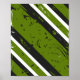 Um fundo abstrato ousado com faixas diagonais em verde vívido, preto profundo e branco brilhante. As listras são colocadas em camadas com uma textura granulada que inclui arranhões, bordas em apuros e placas de tinta dispersas. Os efeitos de pincel grosseiros aumentam o movimento e a intensidade, dando ao design uma sensação enérgica, forte e moderna. A combinação de linhas agudas com texturas caóticas cria um contraste impressionante que faz o trabalho de arte se destacar.
