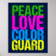 Um presente bonito de guarda colorido para alguém que faz a bandeira girando com a banda de marchar na escola. A Guarda Peace Love Color é escrita em verde, rosa, azul e laranja.