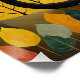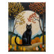 Este trabalho de arte de sereno e capricho apresenta um gato negro em greve como a figura central, sentado polido e majestoso numa paisagem estilizada e autóctone. Atrás do gato, uma lua de cheio luminosa e maciça domina a cena, lançando um brilho suave sobre colinas rolantes e um céu escuro e estrelado. As árvores circundantes são adornadas com folhas vibrantes e estilizadas numa paleta quente de amarelo, ouro e laranja queimado, contrastando lindamente com os tons legal do fundo. A peça combina um sentido de realismo mágico com uma estética de arte popular, criando uma cena ctivante e tranquila cheia de encanto místico.