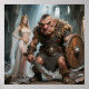 Uma rainha régia está ao lado de um guerreiro feroz em um cenário de castelo arruinado. O cenário é dramático, com luz jorrando através de janelas antigas.