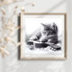 Retrato realista a lápis de uma cinza de gatinho deitado num cobertor macio com uma guitarra acústica e flores.