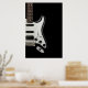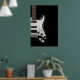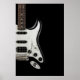 Uma fotografia de perto impressionante de uma guitarra clássica que apresenta o icônico design de corpo ao estilo Stratocaster com o seu acabamento branco contornado e protetor de picareta preto. A imagem mostra os componentes essenciais do instrumento: três pickups de solteiro-bobina, uma prancheta de pau-rosa com pinturas ponto-pérolas, hardware de cromo incluindo o sistema de ponte tremolo e botões de controle de volume e tom duplo. As curvas elegantes do violão e o artesanato profissional são destacados contra um fundo negro dramático, enfatizando o apelo do eterno do instrumento. Esse tipo de guitarra elétrica tem sido a base de rock, blues, jazz e incontáveis outros gêneros musicais, representando décadas de inovação musical e os sonhos de músicos em todo o mundo que moldaram o som da música moderna.