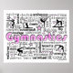 A ginástica diz poster com silhuetas de ginástica e palavras relacionadas à ginástica. Palavras como viga de balanço, cofre, bares irregulares, chão, tropeço, pau, giz, equipe, pau, pega, pega, pega, passarela, e muito mais! ©gollygirls.com