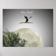 O ginasta voa sobre uma lua de cheio. O brilho da lua clareia o céu escuro e descreve o ginasta que se estende em médio-salto.Árvore no canto inferior esquerdo.
