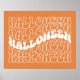 Este design de Halloween surpreendente apresenta uma repetição ousada e brincalhona da palavra "HALLOWEEN" em uma fonte ondulada e inspirada retroativamente. O texto é organizado em várias camadas, criando um padrão visual dinâmico que desenhar o visualizador. A palavra central é destacada em uma laranja sólida e vibrante, fazer que se destaca do texto ao redor, que é esboçado na mesma cor. A tipografia ondulada acrescenta um sentido de movimento e energia, capturando perfeitamente o espírito assustador e divertido do Halloween.