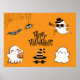 Transforme o seu espaço com este poster de Halloween festivamente assustador! Apresentando um adorável fantasma segurando uma abóbora, um morcego voador brincalhão, uma aranha balançante com sua delicada teia, e um fantasma flutuante alegre com a palavra "Boo" ao lado dela, esta design está explodindo com o charme de Halloween. O texto vibrante do "Feliz Dia das Bruxas", aliado a um chapéu de bruxa caprichosa e dois doces coloridos, faz deste poster uma decoração perfeita para sua casa, sala de aula, local de festa ou escritório. Impresso em papel de alta qualidade, com cores fortes e ousadas, com certeza trará vibrações festivas e colocará todos no espírito do Halloween!