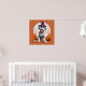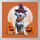Dalmaciano bonitinho com chapéu de bruxa roxa com boias de boia-o-lanternas assustadoras para o Halloween.
