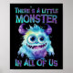 Cute e bobo roxo, azul, monstro peludo do Halloween com a citação, Há um Pequeno Monstro em Todos nós".