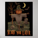 Espantalho assustador com a cabeça de abóbora, gato preto e cemitério lua — vibrações perfeitas do Halloween.