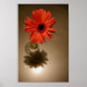 Uma margarida vermelha-alaranjada vívida iluminada de cima para revelar uma silhueta de flores aladas.