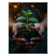 Hands cradle rich, dark soil from which a vibrant young plant emerges, its fresh green leaves unfurling toward soft golden light. Tiny dew drops glisten on the foliage and earth, while warm amber bokeh orbs float in the blurred background like distant fireflies or embers of hope. Gentle rim lighting outlines the fingers and soil edges, creating an intimate, almost sacred moment of nurturing and new life. The composition radiates quiet strength, renewal, environmental care, and the simple miracle of growth—evoking themes of sustainability, mindfulness, beginnings, and the fragile beauty of nature.