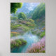 Este trabalho de arte digital representa uma serena e um riacho idílico significando através de uma paisagem atordoante, repleta de cores vibrantes e beleza natural. O riacho está revestido com uma relva verde e árvores, e um conjunto colorido de flores enfeita seus bancos, acrescentando ao cenário pitoresco. À distância, montanhas majestosas subem, criando um pano de fundo de tirar o fôlego para a cena. O efeito geral é de paz e tranquilidade, convidando o espectador a mergulhar na beleza da natureza.