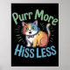 Este gráfico charmoso apresenta um gato animado com pele de pele entupida por cores impressionante em pedaços azuis, laranja e brancos, esportando uma gravata de arco roxa. O gato tem olhos verdes largos e expressivos e um sorriso feliz e aberto. O texto, "Purr More Hiss Less", é apresentado em duas cores distintas: "Purr More" em verde e "Hiss Less" em azul claro, defendendo um temperamento felino positivo. O design é colocado sobre um fundo preto sólido. Download digital apenas para uso pessoal.