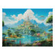 Vista de terra verde limão numa ilha com um castelo mágico rodeado de cachoeiras