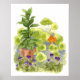 Poster de arte botânica com uma baía cercada crescendo no jardim perto de uma flor de nastôncio laranja brilhante pintada em aquarela. Adorável decoração de arte na cozinha!