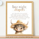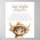 Sinal de Chá de fraldas de Fraldas Noturnas de Vaca Alta. Disponível digitalmente e impresso. Personalize facilmente o texto conforme necessário. Com uma bela ilustração de vaca em terras altas.