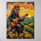 Este trabalho de arte dinâmico retrata um leão, olhando facilmente legal em óculos de sol e uma jaqueta de couro, "raspando" magistralmente um violão elétrico enquanto pregava numa rocha. A cena se desenrola sobre colinas verdes rolantes e árvores distantes sob um vasto e feroz céu por pôr do sol. O espesso e expressivo impacto que cria uma textura tangível, fazer da declaração "Rock or Die", ressoa com a energia bruta do desempenho.
