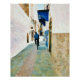 Um ciclista solitário navega por um corredor pitoresco e estreito numa cidade mediterrânica. As paredes brilhantes e texturizadas e o caminho das pedras evocam um senso de serenidade e beleza eterno.