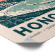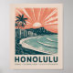 Honolulu, na ilha de Oahu, no Havaí, é um dos destinos turísticos mais famosos do Pacífico, conhecido pela praia de Waikiki e pelo cone vulcânico dramático Diamond Head. Este design apresenta um estilo de ilustração retrô vintage, inspirado em pôsteres clássicos de viagens do meio do século. A composição usa linhas ousadas e simplificadas e detalhes gráficos limpos para destacar a silhueta da cidade, a costa curva e as ondas do Oceano Pacífico sob um céu radiante de pôr do sol.