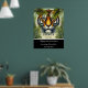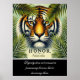 Em uma cena de selva cativante, um majestoso tigre Bengala colega através de folhas de palma verdes e peludas. Suas vibrantes listras laranja e preta são iluminadas pela luz suave, enquanto os olhos âmbar intensos exaltam sabedoria e força. O fundo desfocado da selva melhora a atmosfera selvagem, permitindo que a presença poderosa do tigre domine a composição. No topo, a palavra "Honra" está elegantemente inscrita em um roteiro amarelo ousado, simbolizando dignidade e significância. Abaixo do rosto do tigre, as palavras eternos de Aristóteles - "Dignidade não consiste em possuir honras, mas em merecê-las" - aparecem em uma escrita graciosa, com seu nome cuidadosamente atribuído em uma fonte menor. Os verdes ricos da folhagem contrastam com o fundo preto escuro, moldando a nobre face do tigre. Esta composição visualmente deslumbrante convida os telespectadores a se relacionarem com temas de coragem, integridade e a beleza primitiva da natureza.