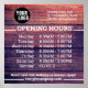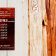 Placa de horário de funcionamento com fundo de madeira rústica. O texto é exibido claramente em uma fonte negrito. A placa apresenta um espaço reservado para logotipo no topo. Cada dia da semana é listado com as horas correspondentes e 'FECHADO' para domingo. A atmosfera geral é quente e convidativa, adequada para um ambiente empresarial.