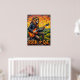 Esta trabalho de arte imaginativa mostra um leão, uma verdadeira estrela do rock com óculos de sol e uma jaqueta de couro, desencadeando "corpos selvagens" em uma guitarra elétrica de uma rocha proeminente. Seu palco é uma vasta paisagem de colinas verdes e árvores espalhadas, banhadas pela dramática luz de um sol de pôr. As braçadas texturizadas dão uma sensação crua e enérgica, capturando perfeitamente a atitude de "Rock or Die" dessa inesperada atuação de natureza selvagem.
