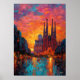 Arte expressionista vibrante do horizonte inspirado em Barcelona e na icônica Sagrada Família. O pôr do sol brilhante, a arquitetura colorida e as texturas dinâmicas de pincel criam uma paisagem urbana dramática cheia de energia. Arte de parede perfeita para amantes de Barcelona, arquitetura e pinturas expressionistas modernas da cidade.