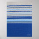 Padrão de crochê riscado em tons de azul e branco. O efeito é como se se olhasse para o horizonte a partir da borda da água.