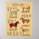 Ilustrações anatômicas do cavalo mostrando os órgãos internos, esqueleto, músculos, artérias e veias. Gráfico de anatomia dos equídeos para a clínica veterinária ou a educação escolar.