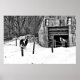 Imagem negra e branca de cavalos e celeiro durante uma tempestade de neve localizada no Maine Norte