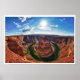 Lindo fotografia da Benda de Ferradura, uma virada no Rio Colorado no Grand Canyon, como se vê de cima. Acima do desfiladeiro, o sol brilha num céu azul com vãos de nuvens brancas.