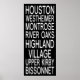 Esta poster é uma lista de alguns dos lugares mais reconhecidos na cidade de Houston, Texas, na Tipografia de um branco moderno sobre o fundo preto clássico. Westheimer é onde estão os Hotéis e grandes lojas, Montrose é o Distrito Artista, River Oaks é onde vivem os ricos e famosos, Highland Village é para lojas e boutiques de compro em escala superior, Upper Kirby é a rua de elite e Bissonnet é o Distrito do Museu.