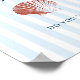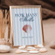 This elegant, downloadable 'How many shells do you sea?' sign features a vintage inspired, red drawn illustration of a seashell on a soft blue striped background.
