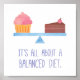 "Tem tudo a ver com uma dieta equilibrada." Não concorda com nutricionistas? Temos, e aqui está, uma dieta equilibrada, um cupcake e uma fatia de bolo de chocolate com uma cobertura de cereja que equilibre perfeitamente numa escala! Decorre sua casa com essa divertida e engraçada impressão de poster de dieta. Excelente para meninas que têm um doce dente para pastéis e doces.